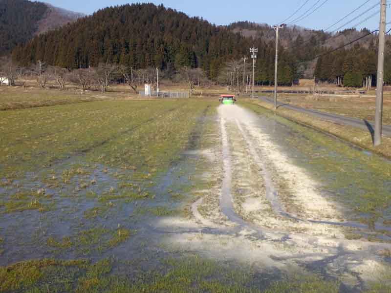 お米の生産だけでなく販売までの業務を行っていると、自社の精米作業だけでも結構な量の米ぬかが出ます。その米ぬかを田んぼに撒いています。本当は土づくりのために秋に撒いてあげるのが良いのですが、米ぬかって保存しようと思ってもすごい量の虫が湧くのであまり取っておきたくないのです。生の有機物を土にすきこむと雑草が発生するリスクがあるので、なるべく雪解け後すぐに撒くようにしています。