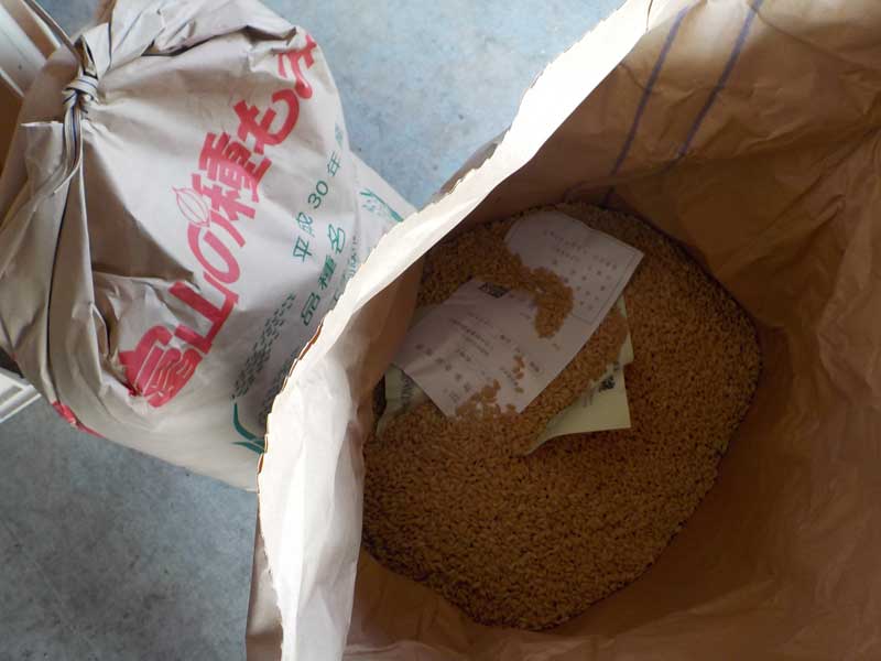 まずは今年も「ハナエチゼン」という品種の消毒から始めます。通常は昨年の収穫時に自家採種した種もみを使いまわすのですが、何年かに一度、品種更新のために購入した種もみを使用します。販売している有名な品種の種もみはほどんどは富山県産で、種もみ生産全国一位らしいです。