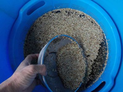 古代米は野生の原種に近いのか、スカスカのモミや軽いものが多く、真水で選別しても半分以上浮いてしまいます。塩水だと全部浮きます。