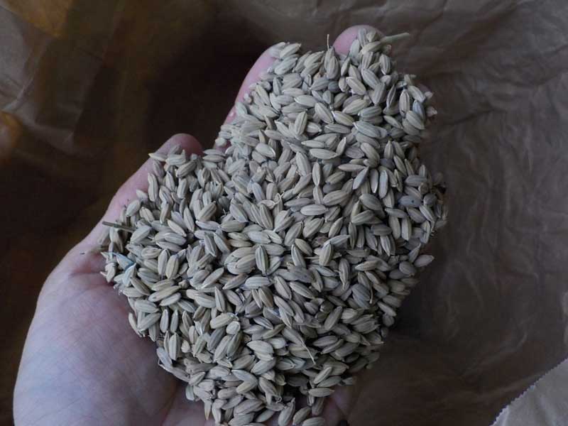 こちらは緑米の種籾。籾殻の色と中の玄米の色が一致しないので、間違わないように注意します。他に赤米も作っています。