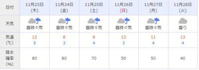 北陸地方の冬の天気は、基本的に曇りか雪です。今週の福井の天気を見てもこれからずっと雨続きで、だんだんと冬に近づいてきているのがわかります。もっと寒くなると雨が雪に変わります。
