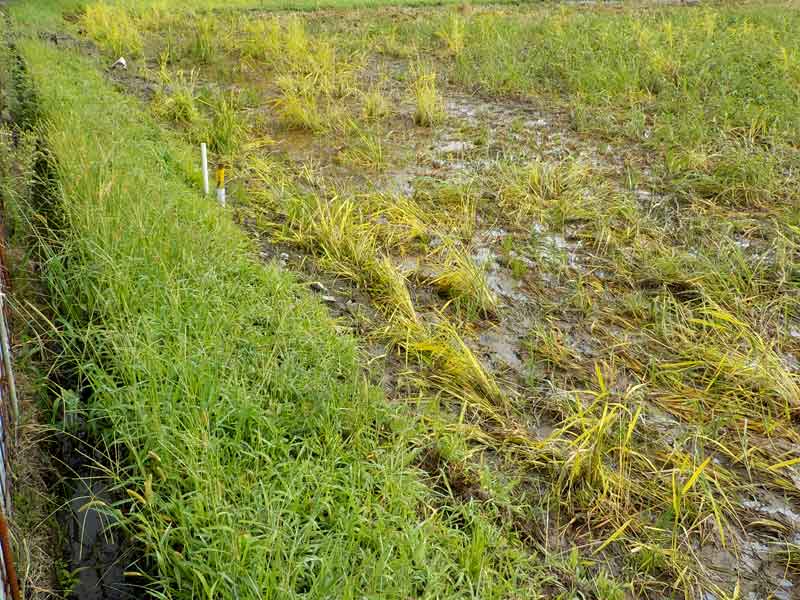 田んぼで遊ばれるとこうなります。稲を倒してグチャグチャにしてしまうので収穫できません。なので、毎年全力で対策をしています。近くに山や大きな川がある地域ならではの悩みです。