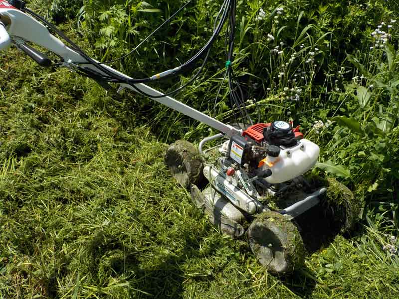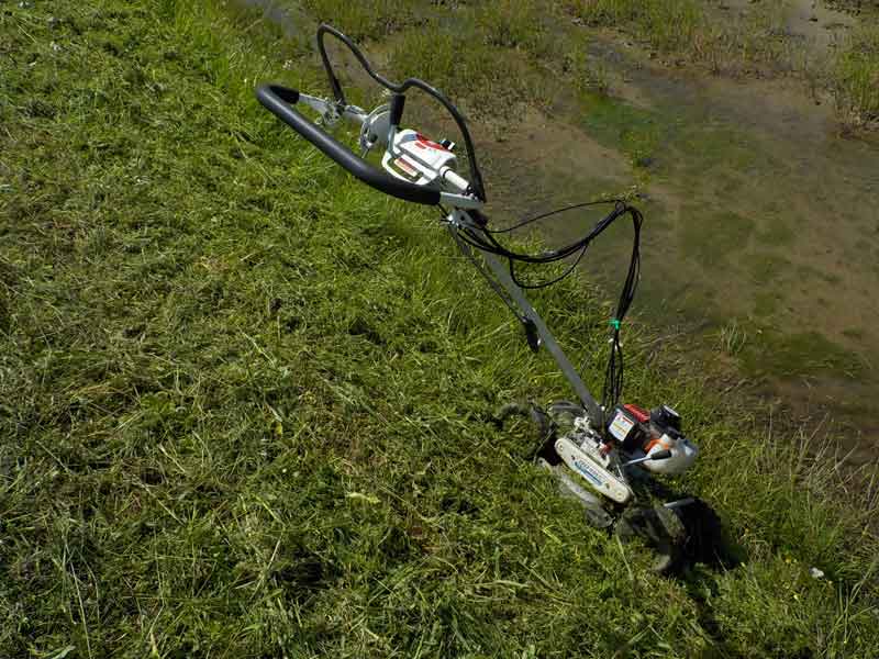 オーレックのスパイダーモアです。刈払機と違って手で持っているだけで勝手に進んで草を刈ってくれるのでたいへん楽です。飛び石も全くと言っていいほどないので割と安心できます。