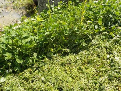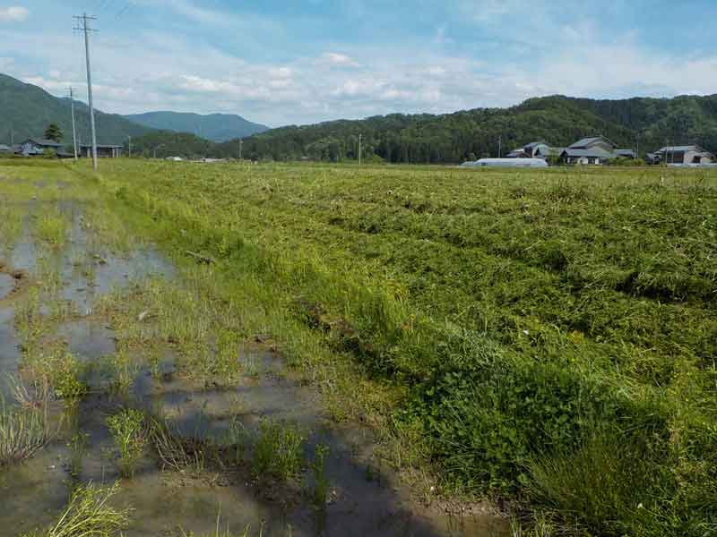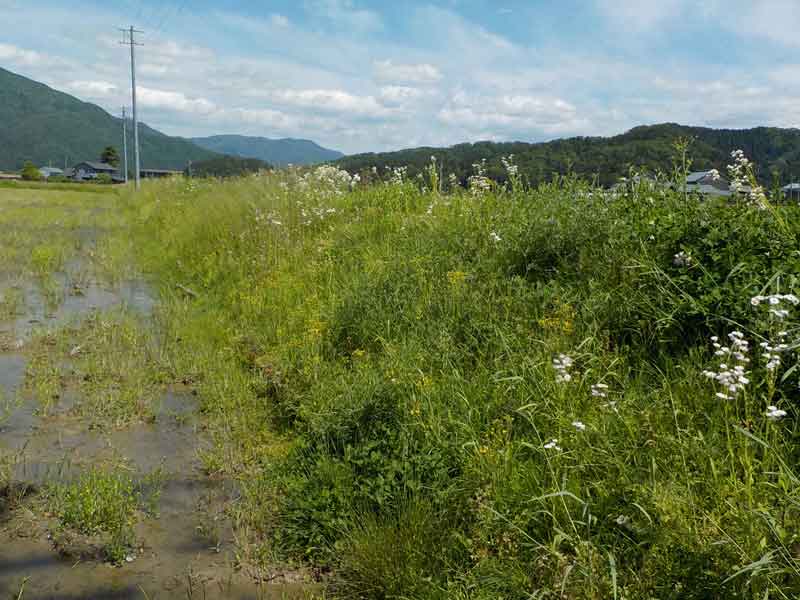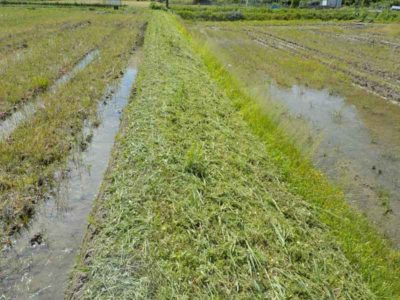 あぜ道の草刈りに刈払機では時間がかかりすぎるので、芝刈り機みたいな機械なども使って作業をしています。