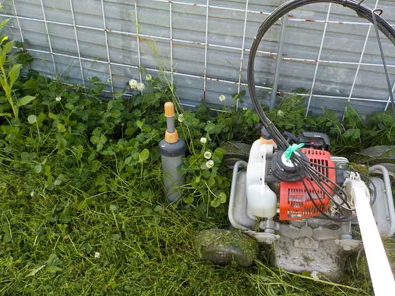 刈った後も”キレイ”というほどでもなく、タイヤの下敷きになった草は刈れないし、長い草は刃に絡まってうまく刈れないなど、刈払機と比較すると悪い面の方が多いような感じはしますが、個人的には圧倒的にスパイダーモアの方が好きです。とにかく「短時間で楽に草刈りが終わる」という何物にも代え難いメリットがあるので、モアであらかた刈って、刈り残しを刈払機で刈るという方法で作業をしています。農業はつらい作業が多いですが、長く続けるためには「楽をする」といういこを考えることも大切だと思います。