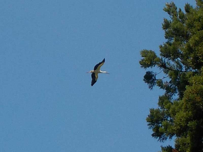 コウノトリでした。シラサギやアオサギとは違って首をまっすぐにして飛ぶので、それで見分けがつきます。大塩の巣塔のある地域はカラスの縄張りなのでちょっと離れた山奥まで飛んできたのでしょうか。