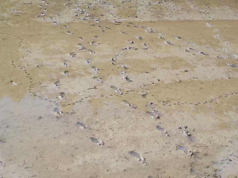 さらにイノシシやシカなどの野生動物の棲みかなので、いろいろと対策をする必要もあります。田植直前の水を張った田んぼでもたくさんの足跡がついています。田植え後の時期だとシカが問題で、少し大きくなった苗を食べてしまいます。