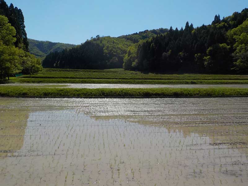 今回は山間部の田植えがメイン。山の中の田んぼは基本的に陽当たりが悪いので、あまり収量や食味の期待はできません。特に東側に山があると朝日が全く当たらないので、平地の稲と比べても生長度合いが全く違います。