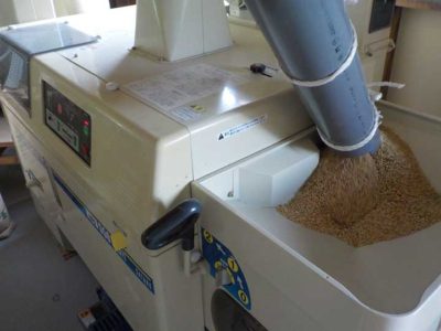 乾燥機で籾(もみ:殻つきの玄米)の水分を15%以下にまで落とし、籾すり機に入れて殻を取ります。