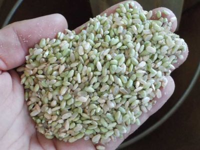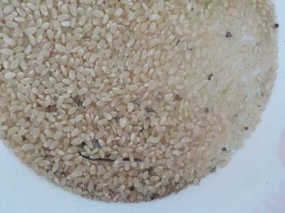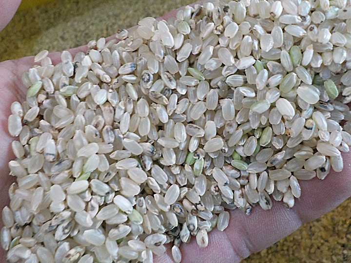 これは色彩選別を1回だけかけた今年のハナエチゼンの玄米です。今年のお米は乳白と未熟米がとにかく多いです。良作だった昨年の倍ぐらいはありそうです。
