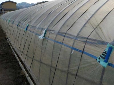 最後に上面のシートが飛ばないようにビニール紐でかなり強めに固定します。風の力は凄いもので、パッカーで簡単に止めただけでは風が中に入ってシートが破れたり、飛んでしまったりと結構ひどいことになります。ビニールハウスの保険みたいなものもあり、災害で破損すると補償してもらえたりもします。
