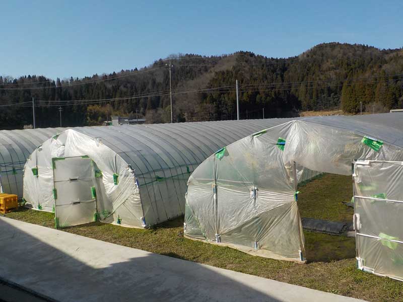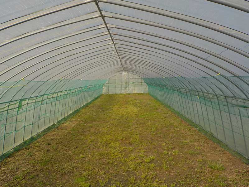 ハウスの側面を張って、天面を掛けて、ビニール紐で全体を固定して完了。だいたい1棟あたり1時間~1時間半ぐらいの作業です。風が強いと作業が出来ないので、早めの午前中がねらい目。