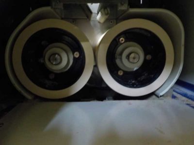 モミすりというのは、その名の通りモミ(殻付きの玄米)を狭いゴムロールの間を通して、その摩擦(擦り合わせ)で殻を剥く工程です。