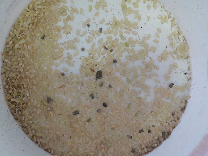 まず、石抜き。お米の中には見ただけではわからないくらいたくさんの石が混じっています。これをやらないとごはんに石が混じって、歯が欠けます。地面が柔らかい田んぼの稲を刈ると稲と一緒に泥も入ってしまうので、石が混じりやすくなります。