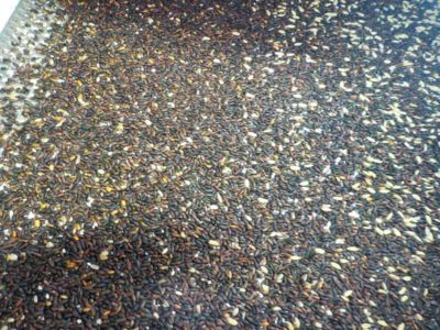 一番最後は古代米。他のお米と混ざるとマズいので毎年一番最後になります。古代米といっても特殊なお米ではなく、単なる色の付いたもち米の玄米なので、それほど”おいしい食べ物”ではありません。