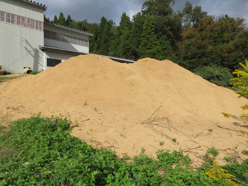 もみ殻の山。高さ5m以上の山脈みたいになっていますが、これ全部お米の殻です。籾殻は雨に濡れてもほとんど染み込まず、とっても腐りにくいので毎年処分に困ります。