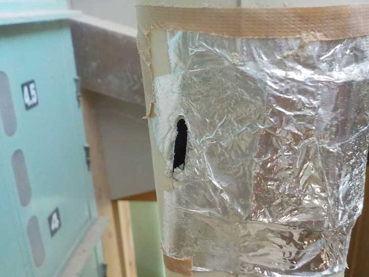乾燥機の排出口に写真のような鉄でできたパイプがあるのですが、ここを通って籾が出ていきます。この時にパイプの内部を傷つけて穴が開きます。