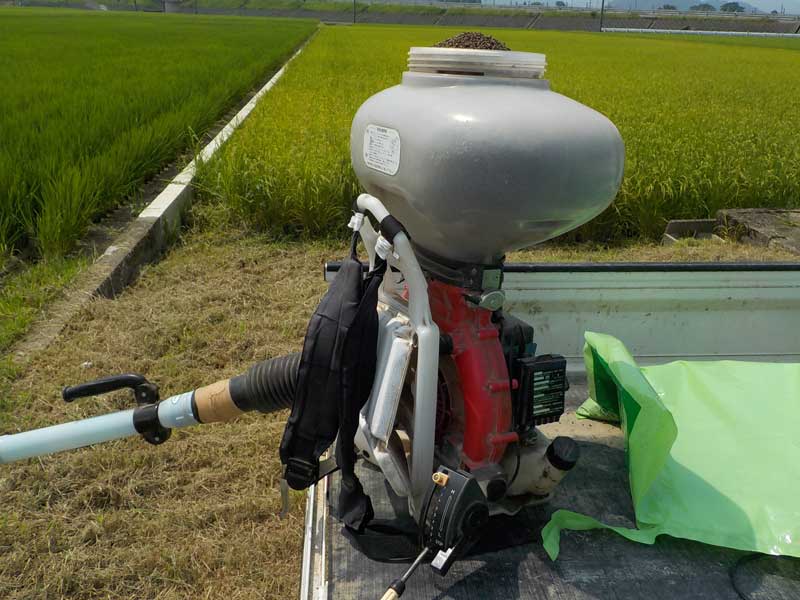 梅雨がなかなか明けないので遅くなってしまいましたが、今日は穂肥を散布。散布機に肥料を入るだけ詰めて、それを背負って田んぼの畦道や田んぼの中を歩きます。だいたい30~40kgの荷物になるので、この炎天下だと1回背負っただけで汗だくになります。