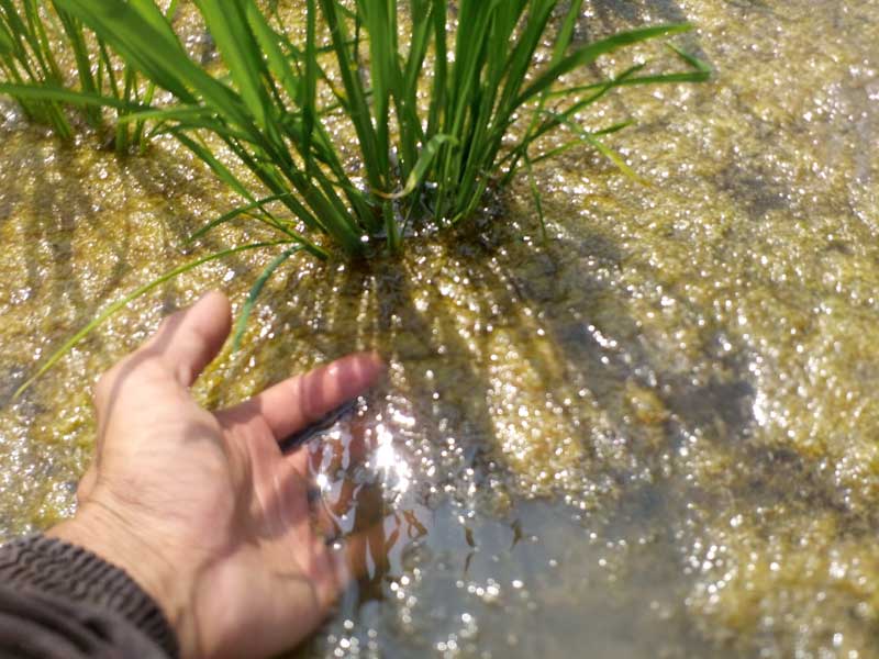 藻の上の水はお風呂のお湯みたい。そのうち稲が茹ってしまうのでは?と思うくらい熱いのです。少し早めに落水しようかと思います。