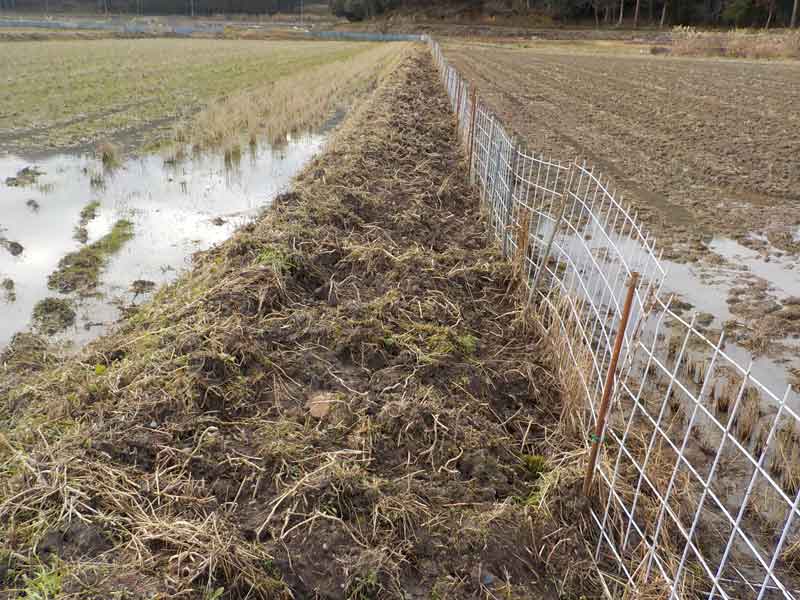 暖かいと元気なのがイノシシ。田んぼの畦(アゼ)がどんどん耕かされていきます。野生の動物なのでエサを探すのに必死なのはわかるのですが、ここまでされると・・・。今年のこの田んぼの草刈りは大変そうです。