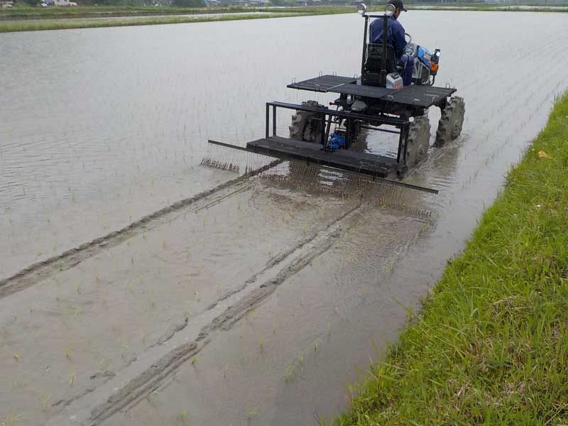 先週植えた無農薬栽培のタンチョウモチ(もち米)のチェーン除草。除草はとにかく最初が肝心。雑草が大きくなってからだと大変なので、発芽仕立ての雑草をすだれ状のチェーンで引っ張って抜いてしまいます。田植え3日目から3日おきに入ります。