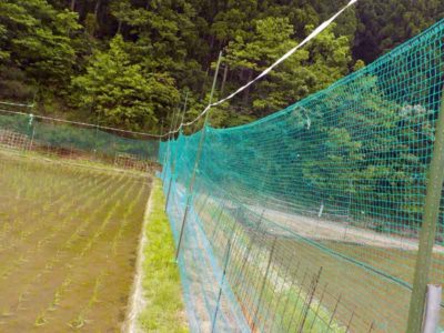 こちらは山奥の田んぼの鹿対策のネット。まず支柱を立て、2mの高さまで防獣ネットを張り、さらに2.5~3mの高さまでビニール紐を張ります。大げさかも知れませんが、これぐらいやらないと鹿は跳んで入ってきます。