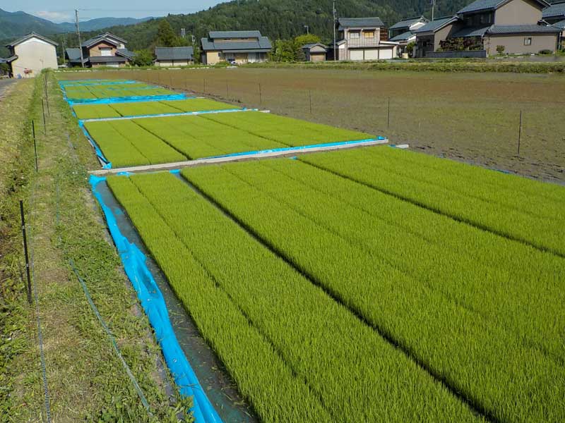 ビニールハウスに入りきらない苗は田んぼで育てます。5月中旬にもなるとビニールハウスの外の方が快適なので、広い場所さえあればどこでも育苗はできます。ただ、苗箱の運搬は面倒です。