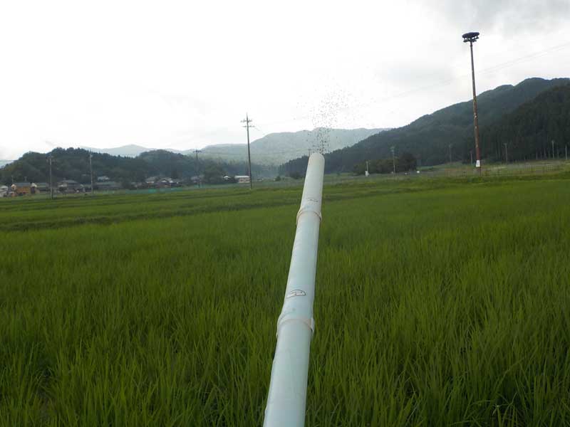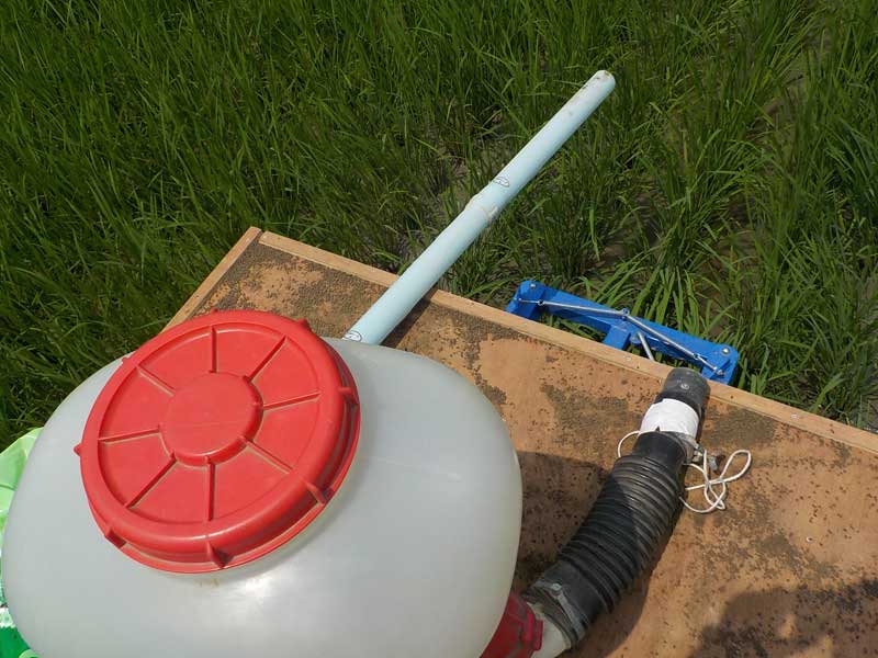 この時期の作業は追肥と溝切りと空いた時間に田んぼの草刈り。管理機の後ろに台を作ってその上から動散で追肥をしています。重い動散を背負って田んぼの畦や田んぼの中を歩かなくても良い分楽ですが、あまりきれいには散布できません。