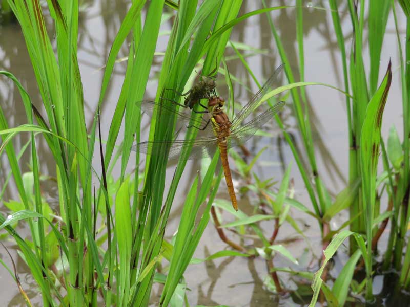 この時期はトンボの羽化の時期で、早朝に田んぼに来るとヤゴがトンボに脱皮するのを見ることが出来ます。特に無農薬栽培の田んぼは数が多いようで、稲に近づくと一斉に飛び立ちます。秋の稲刈りの季節になると本当に無数の赤トンボが舞うようになります。田んぼというのは稲を育てる場所だけでなく、こういった自然界の小さな生き物を育てる場所でもあります。