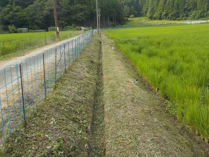 草を刈ったら側溝の掃除も大切です。大雨が降ると刈った草が水路に詰まって田んぼに水が溢れて入ってしまいます。この時期は田んぼを乾かさないといけないので、田んぼに水が入ってくると困ります。