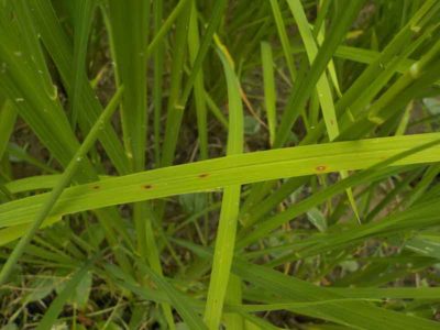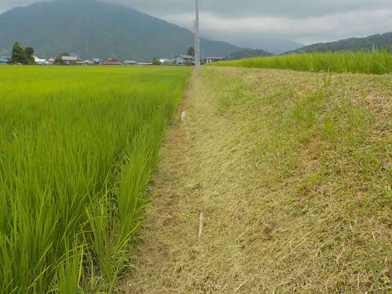 草を刈っていてちょっと気になったのがこの斑点。イモチ病の病斑です。この病気は稲を枯らしてしまいます。イネ科の雑草から伝染することもあるので、そういった意味でもこまめな草刈りは大切です。
