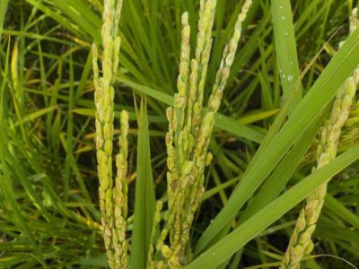 これは昨年の台風の被害に遭った稲。まだ穂が青くて柔らかい状態のときに強い風に煽られると、穂どうしが擦られて傷がつき、そこから雑菌が入ります。