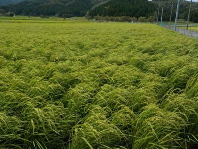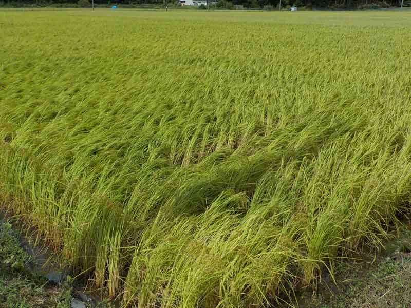 それでもコシヒカリなど大きな穂を付ける品種などは、結構倒れている田んぼが多いような感じがしました。完全に倒れてしまうとお米が水に浸かって腐ったり、発芽してしまったりします。倒れにくい稲作りというのは水管理や肥料管理で可能なので、台風シーズンまでに対策をしておきます。