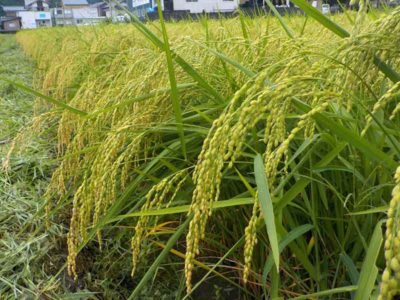 稲穂も雨に濡れて重たそうです。これはハナエチゼンの次に刈る予定のカグラモチという品種ですが、そのうち台風でも来れば倒れてしまいそうな状態になってきました。今年初めて栽培した品種ですが、出来は良さそうです。