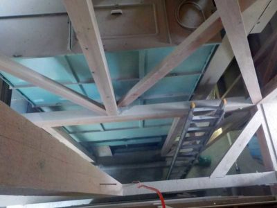 まずは掃除の基本通り一番高いところから。乾燥機の天面には結構な量の埃や籾クズが溜まっているので、それを落としていきます。コンプレッサでエアをシューっと吹くと、あっという間に視界が真っ白になってマスクをしていても息が苦しくなるほどの埃が立ちます。