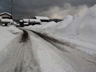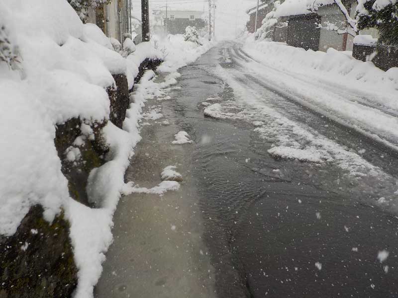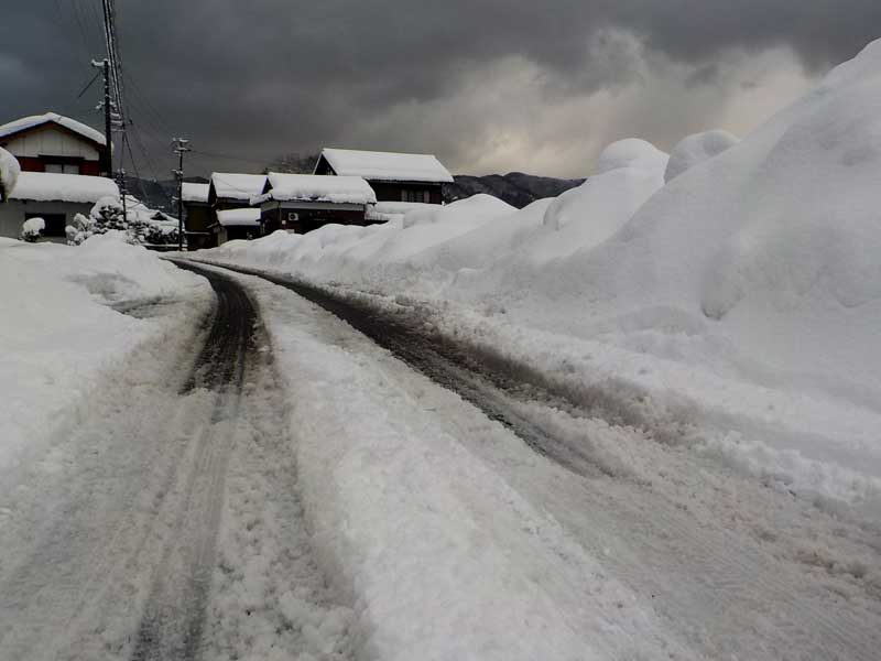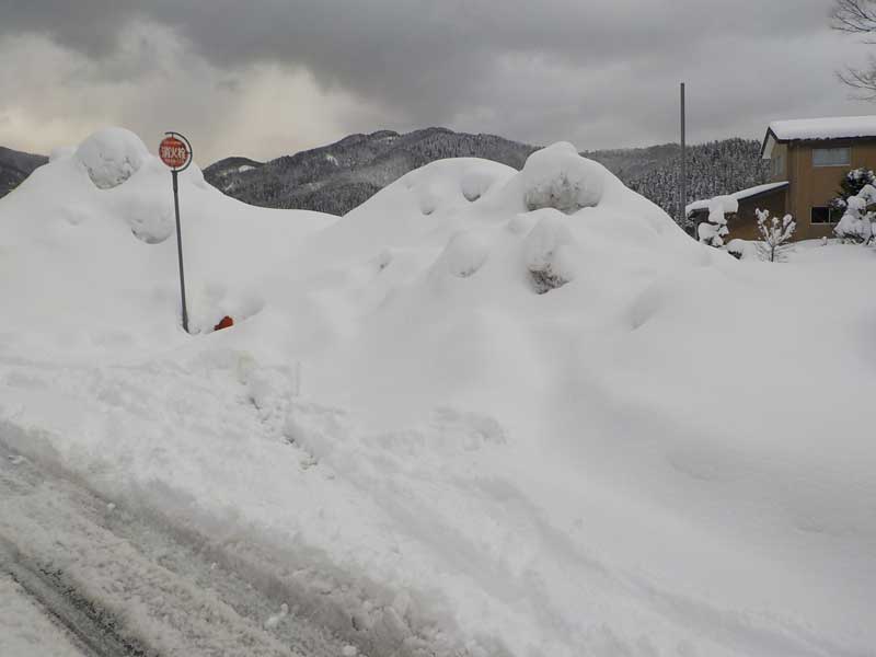 毎日の除雪で道路わきは雪の壁が出来ています。道路も狭くなるので対向車が来ると譲り合いです。