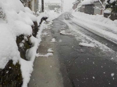 普段はけっこうな水量のある川ですが、みんなが雪を捨てるので詰まってます。道路にまで水があふれて川と道路の区別がつきにくく危ないです。でも意外と車が落ちたということは聞きません。