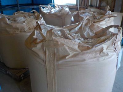 種蒔きに使う土が入った1トンバック。この土は焼いて消毒してあるちょっと特殊な種蒔き用の土で、割と良いお値段がします。育苗箱1箱にだいたい5kg詰めるので、この袋1つで約200枚分の土です。