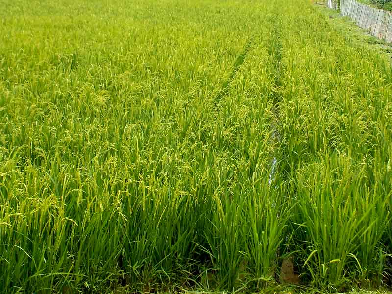 出穂後のハナエチゼン。穂が出てからもここまで濃い色をした稲は今までにないくらいです。これがコシヒカリだったら完全にアウトですね。