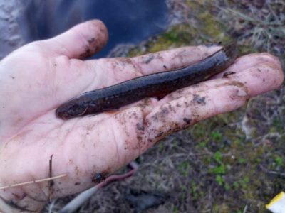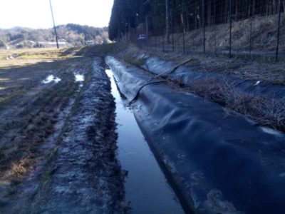 山裾の常に水が流れてくるような水路も泥上げをしておきます。こういう場所は自然のビオトープみたいになっていて、