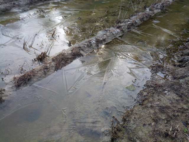 まだ3月なので朝晩は寒いですね。田んぼの水面にも氷が張っています。
