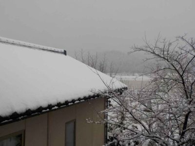 昨日までは瓦が見えていたのに、一晩でそこそこ積もりました。