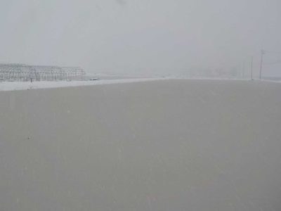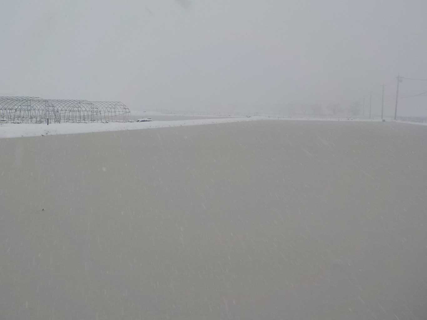 水を張った田んぼもこんな感じです。そのうち水の上にも雪が積もりだします。雪は上から降ってくるのではなく横から強風と一緒に吹付けてくるので、傘も役に立たず、歩いての外出はほぼできなくなります。