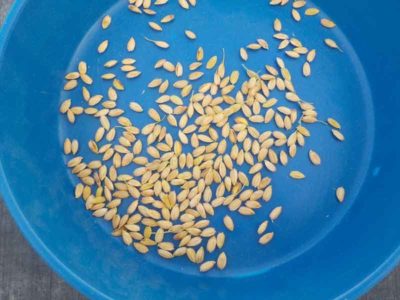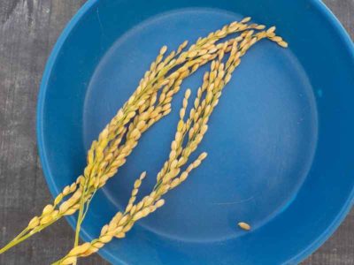 収穫前の稲穂を数本取ってきて籾の水分を調べます。1枚の田んぼの中でも地面が乾かない場所、よく乾く場所があるので、数か所で採ってきて混ぜて調べます。また、稲穂は先の部分から成熟していき、根元の部分は一番最後になるので、稲穂1本でも水分のバラつきがあります。