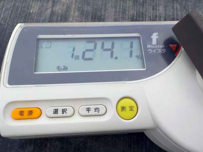 玄米ではなく籾の水分なので、あまり正確ではありませんが24%ぐらい。まだちょっと高めですがこれくらいなら2,3日したら刈っても良いくらいです。
