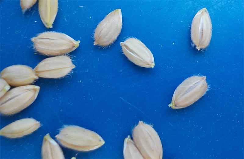 籾をよく見ると、殻が割れているものがたくさんあります。これは気温が高すぎて急激に登熟(成熟)が進んだためです。皮が破れて中身の玄米が見えてしまっており、お米の品質が下がります。8月に登熟する早生品種は割れ籾が発生しやすいですが、今年は特に多いような感じがします。