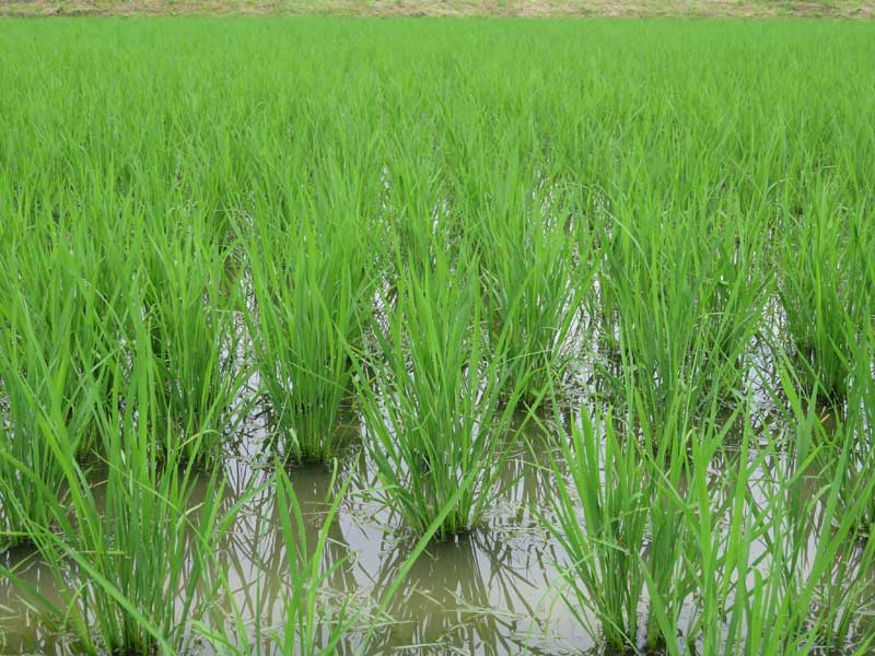 これは田植えから40日目の有機栽培ミルキークイーン。見た目ではわかりにくいですが、水面下にコナギがぎっしりです。何とかここまではやってきましたが、これから雑草が養分を横取りし始めるのでどんどん色あせていき、稲の背丈もべごべご(福井の方言でデコボコの意)になっていきます。穂が出るまであと40日ほど。もう少ししたら追肥の時期です。