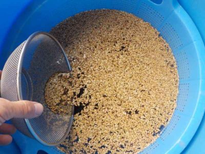 種もそろそろ準備に入ります。これも毎年恒例ですが、塩水選で種籾を選別するところから始めます。昨年のハナエチゼンのモミは登熟が良かったのか、あまり浮いてきませんでした。選別後、消毒をして、その後は1週間ほど水に浸けて芽出しの準備です。