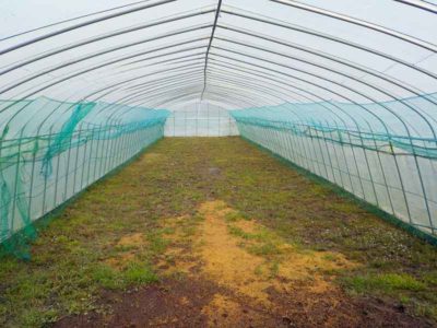 ビニールハウスのシート張り。側面を張って、天井のシートを掛けて、ビニール紐で全体を固定したら完成。1棟1時間ほどの作業です。このシートもずっと使えるものではなく経年劣化で破れたりするのはもちろんですが、材質がビニールなので、だんだんとビニールが固く、色も濁ってきます。日当たりの悪い中での育苗だと苗が徒長しやすくなるので、数年で買い替えです。