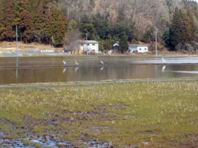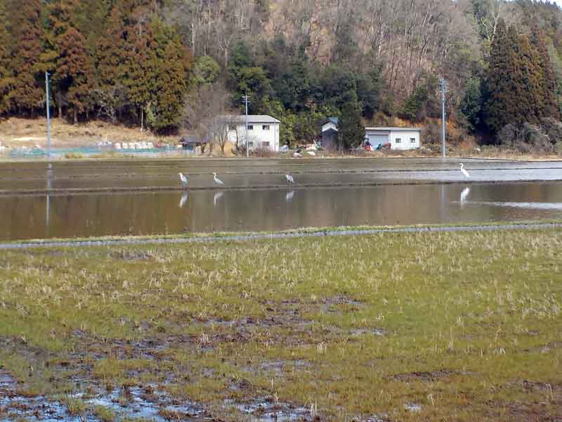 水を張った田んぼにサギが集まってきました。冬眠明けのカエルを食べるためですが、まだちょっと早いみたいです。それにしてもいつも気になるのですが、なぜか全羽同じ方向を向いて休みます。